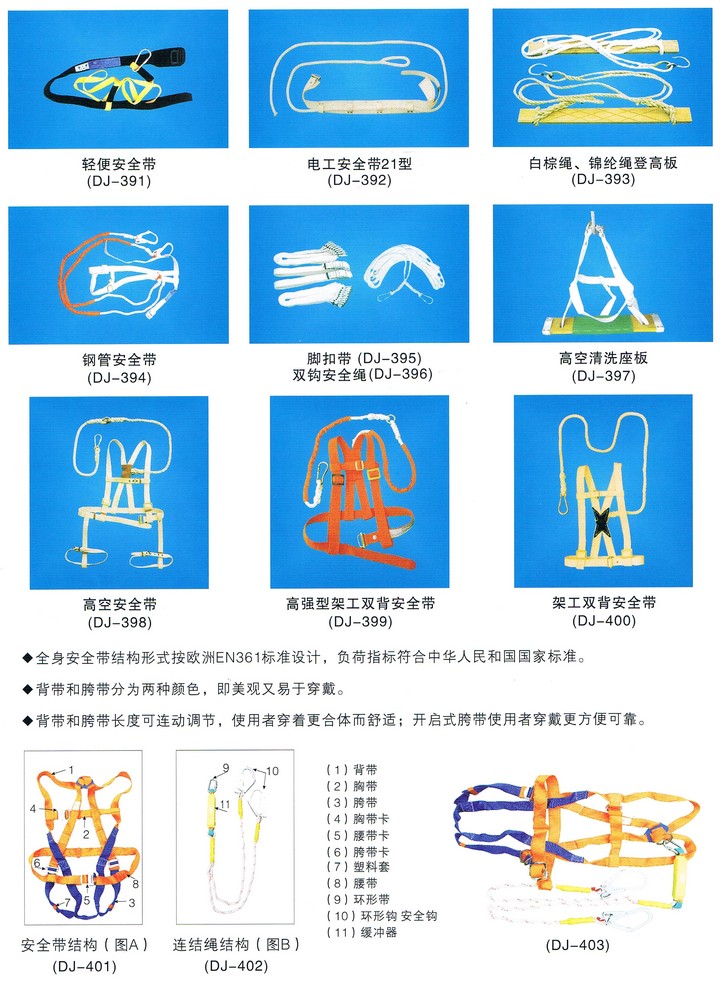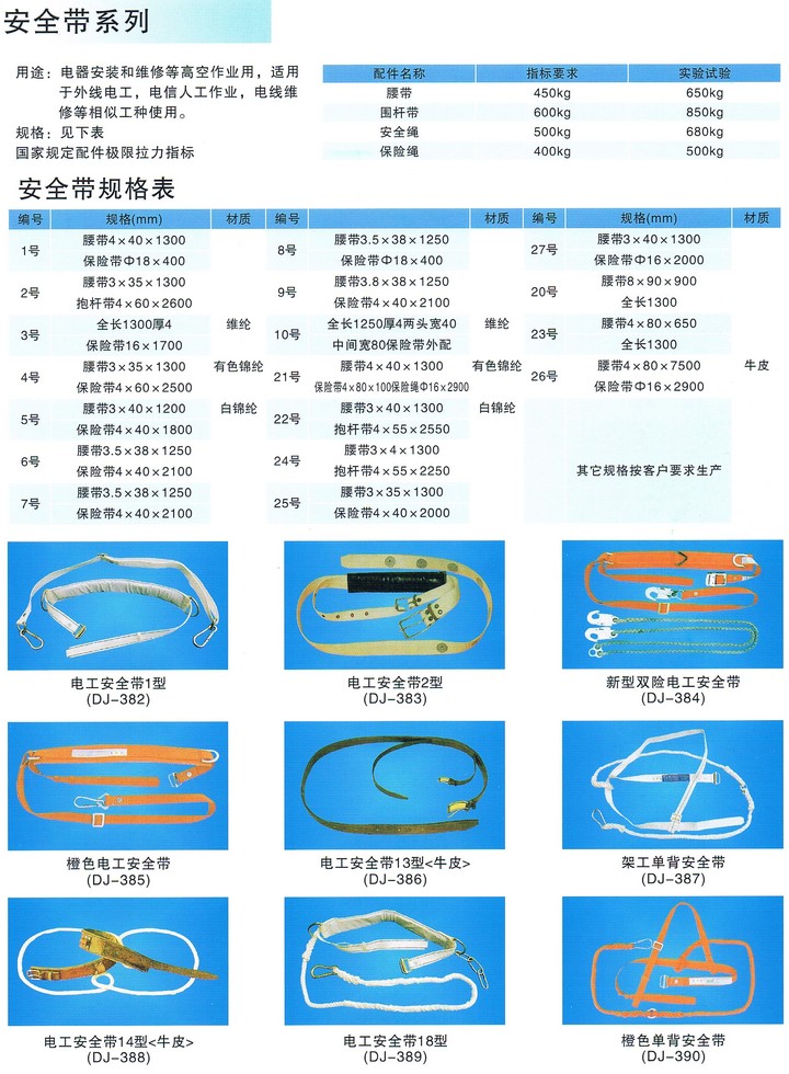 8.安全帶使用兩年后,應按批量購入情況進行抽檢,圍桿帶做靜負荷試驗安全繩做沖擊試驗, 無破裂可繼續使用,不合格品不予繼續使用,抽樣過的安全繩必須重新后才能使用,更換新繩時注意加繩套。