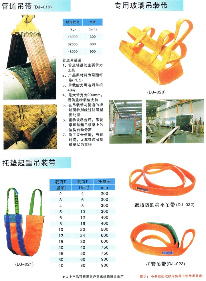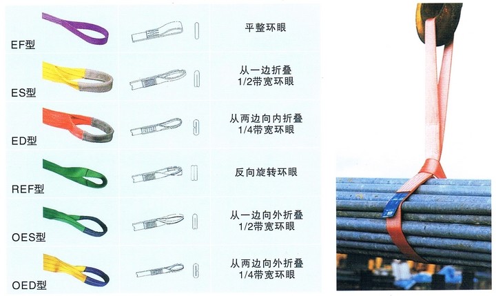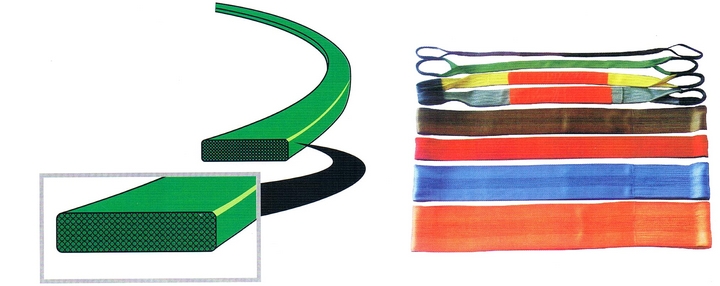 扁平吊裝帶可分為單層,雙層,四層,且縫合方式多種多樣,尺寸可隨用戶的要求而訂(1-50噸載荷,長(zhǎng)度范圍1-100米),承載面寬,可以減少表面負(fù)荷的壓力;扁平吊帶外表面光滑物體時(shí),不會(huì)傷害被吊物,可附加抗磨保護(hù)套及防切斷保護(hù)套,安全系數(shù)比為6:1;扁平吊裝帶設(shè)有獨(dú)特標(biāo)簽,并使用國(guó)際標(biāo)準(zhǔn)色來(lái)區(qū)分承載噸位,即使吊帶被損也易于辨認(rèn),表面可經(jīng)PU硬化處理,增強(qiáng)耐磨性,輕便柔軟,在狹小的空間也易使用;扁平吊裝帶符合中國(guó)行業(yè)標(biāo)準(zhǔn)J8/T8521—1997,吊裝帶的彈性伸長(zhǎng)較小,工作載荷下小于等于 3%,斷裂載荷下小于等于0%,使用的溫度范圍—40℃-100℃。